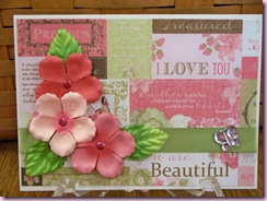 There’s a really wide range of pinks in our exchange cards this month! First up, Holly’s Mother’s Day card using patterned paper and Primas.